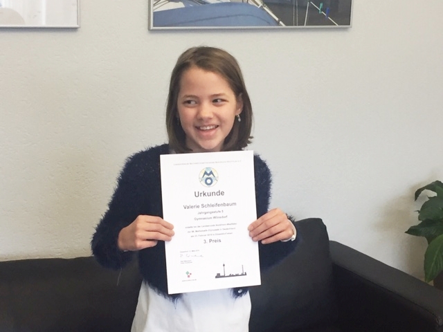 Mit einem hervorragenden dritten Platz kehrte Valerie Schleifenbaum aus der 5d von der Landesrunde der Mathematik-Olympiade zurück. Eine super Leistung – Herzlichen Glückwunsch, Valerie!!! von Sören Leopold