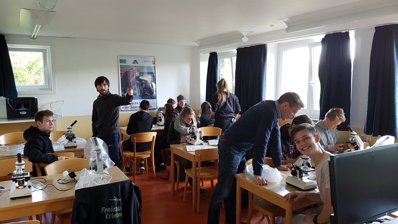 Dies heißt, die Vorbereitung auf das Zentralabitur muss nicht nur im Klassenraum erfolgen: Der Biologie-Leistungskurs der Jgst. 11 mit Herrn Müller, Frau Beyer und Herrn Kneib führte in zweitägiger Freiland- und Laborarbeit am Sorpesee Untersuchungen zur See-Ökologie und zur Photosynthese durch. Die Wasserproben wurden dabei selbst aus der Talsperre entnommen; dazu fuhren die Jugendlichen mit Padelbooten auf das Gewässer. Als Methoden erprobten die Schülerinnen und Schüler u. a. die Mikroskopie von Kleinorganismen aus der Talsperre, die biochemische Bestimmung verschiedener Mineralsalzkonzentrationen und klassische Experimente zur Photosynthese. Auf diese Weise verbanden sich das Erlebnishafte der eigenen Probennahme mit der eigenen Erhebung und Auswertung realistischer Originaldaten und dem eigenen Durchführen bedeutender Experimente.