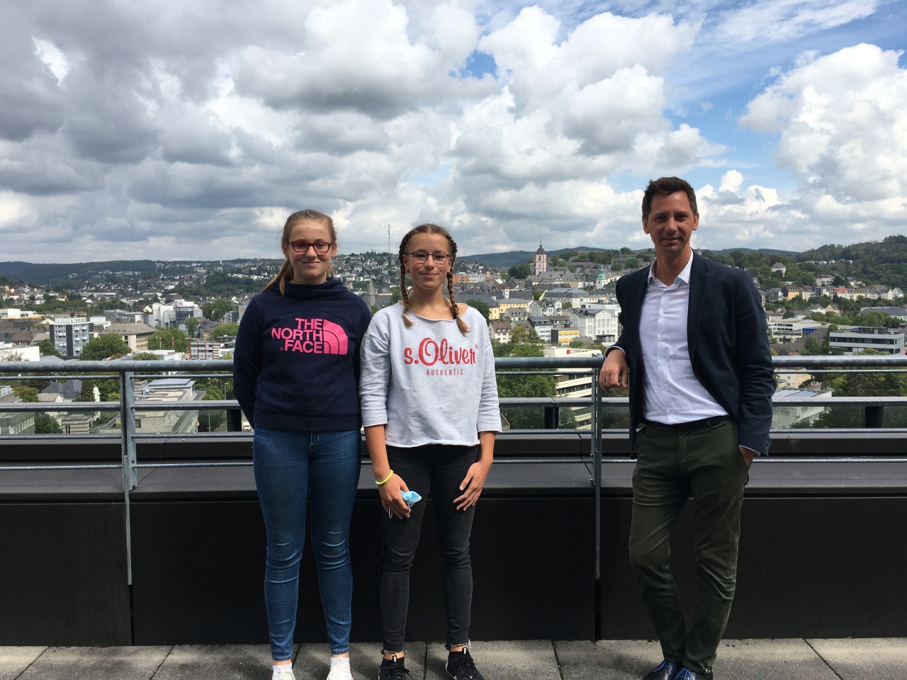 Sina und Larissa machten sich auf den Weg ins Kreishaus in Siegen. Hier trafen Sie den amtierenden (und mittlerweile wiedergewählten) Landrat Andreas Müller (SPD). Herr Müller erzählte Ihnen, was er an seinem Beruf liebt und was ihn eher stört und warum er das Engagement junger Menschen für so wichtig hält. Er zeigte den beiden Schülerinnen den fantastischen Blick über Siegen vom Dach des Kreishauses. Sina und Nele konnten neben vielen Eindrücken eine Videobotschaft des Landrates für die ganze Klasse mitbringen.