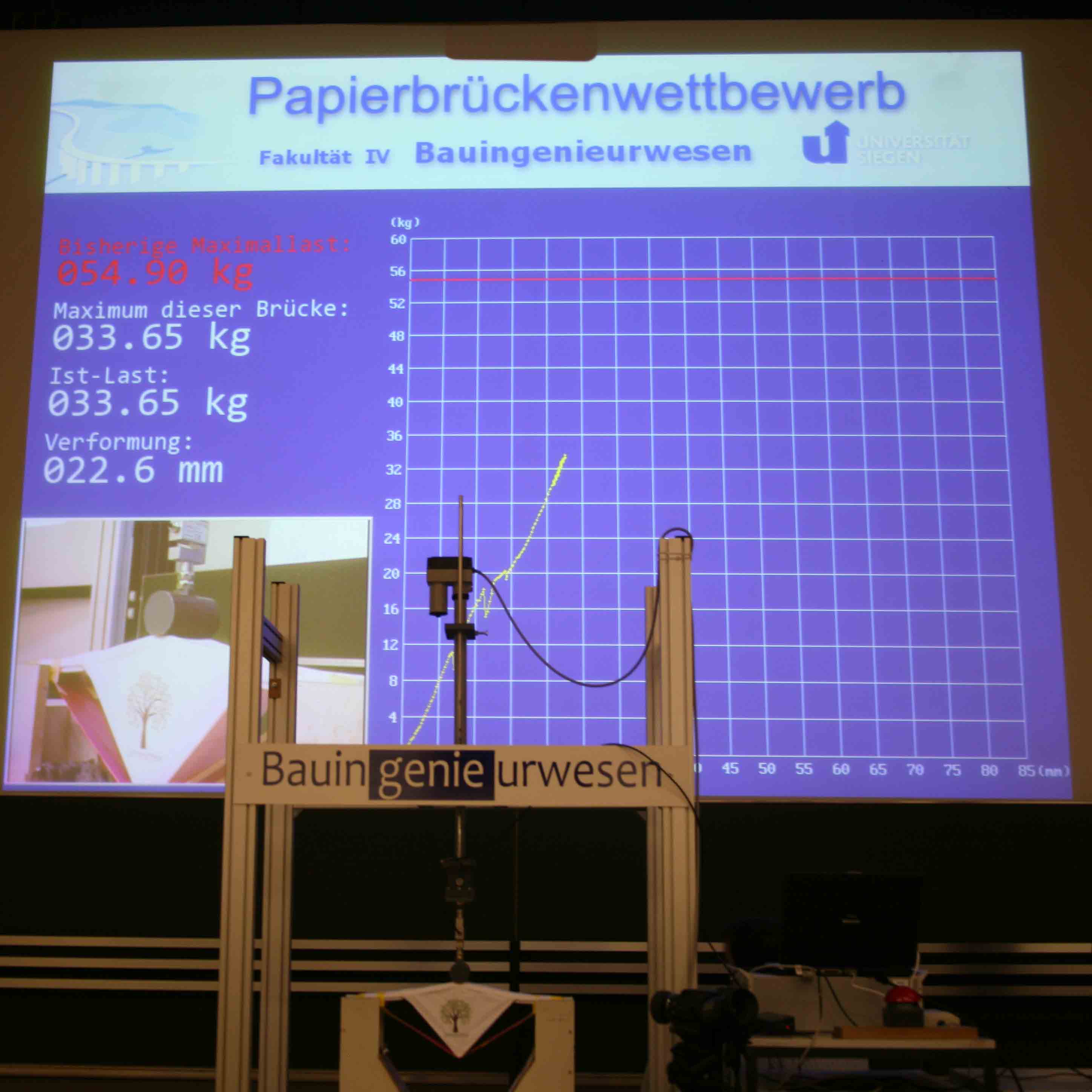 Die sehr leichte Brücke der Fürstler konnte mit 44,8 kg das 482-fache ihres Eigengewichtes tragen und kam damit der Wilnsdorfer Rekordmarke von 487 (aus 2007) sehr nahe.