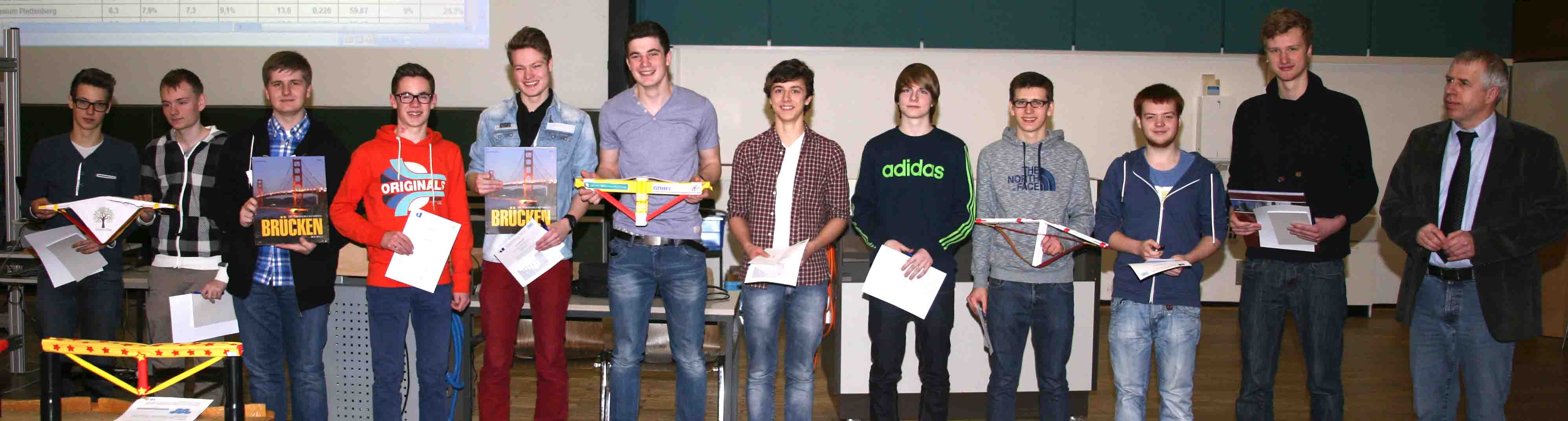 - Platz 2: GyWi-Team 1, Brückengewicht 245 g, max. Traglast 69,6 kg (= 284-fache des Eigengewichts)