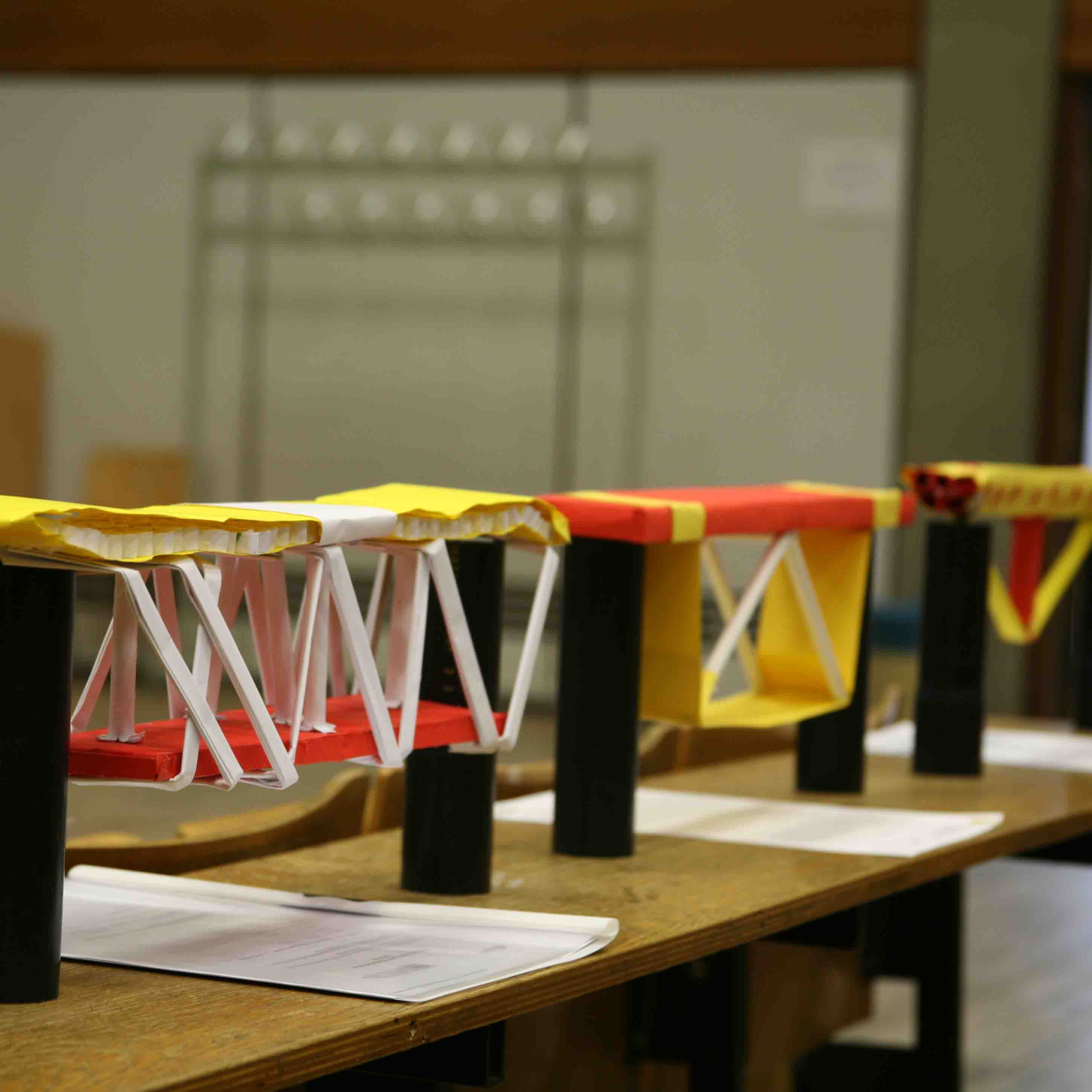 Vom Leistungskursteam wurden die Fahrbahnteile in einer Fachwerkbauweise, vom AG-Team in einer Verbundbauweise aus Papierrollen gefertigt.