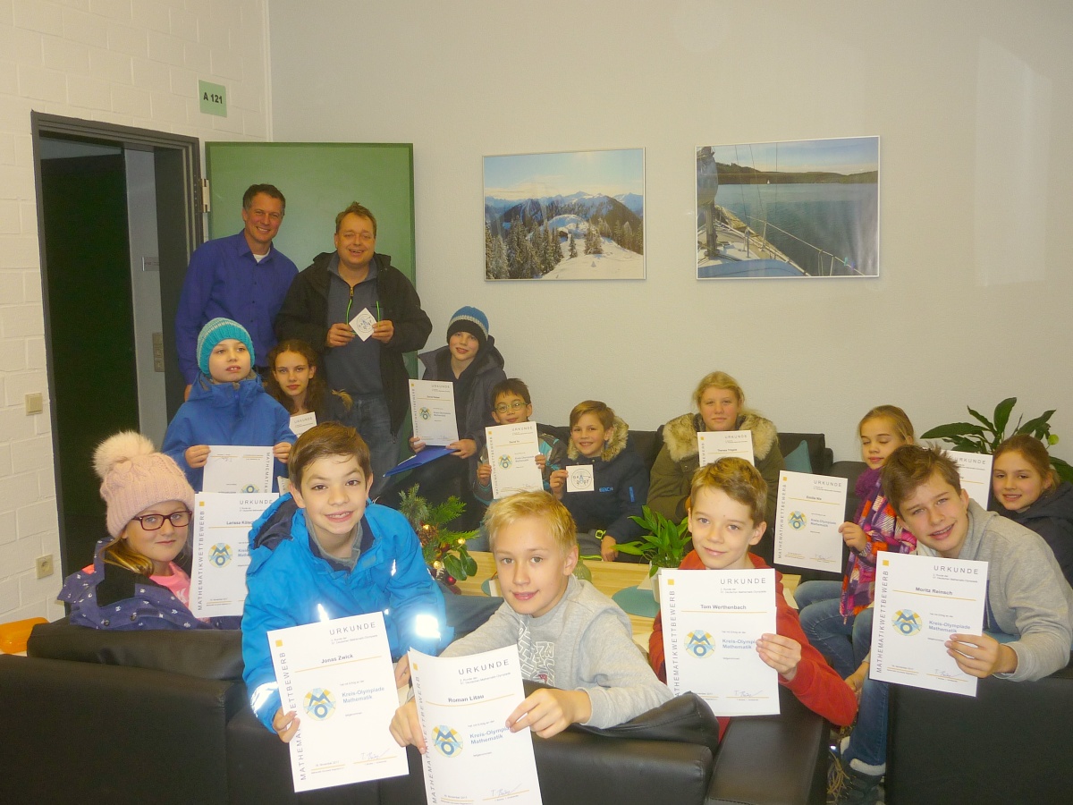 Herr Leopold und Herr Voß übergaben die Urkunden und teilten den Matheassen ihre Platzierungen mit. Und die konnten sich wieder sehen lassen: Insgesamt erzielten die Wilnsdorfer 7 Preise am Gymnasium Auf der Morgenröthe, darunter Tom Werthenbach mit einen hervorragenden 1. Platz (Jgst. 6), David Yu mit einen sehr guten 2. Platz (Jgst. 5) und weitere fünf 3. Preise.