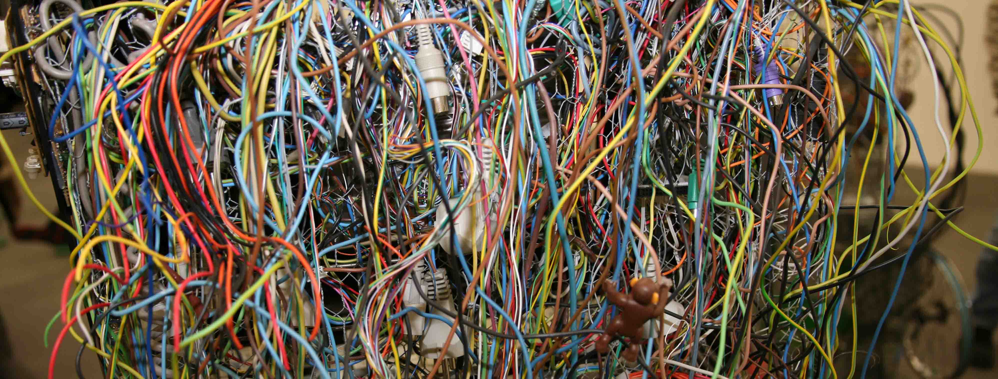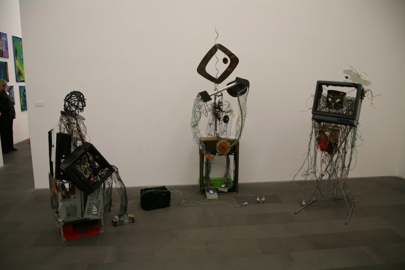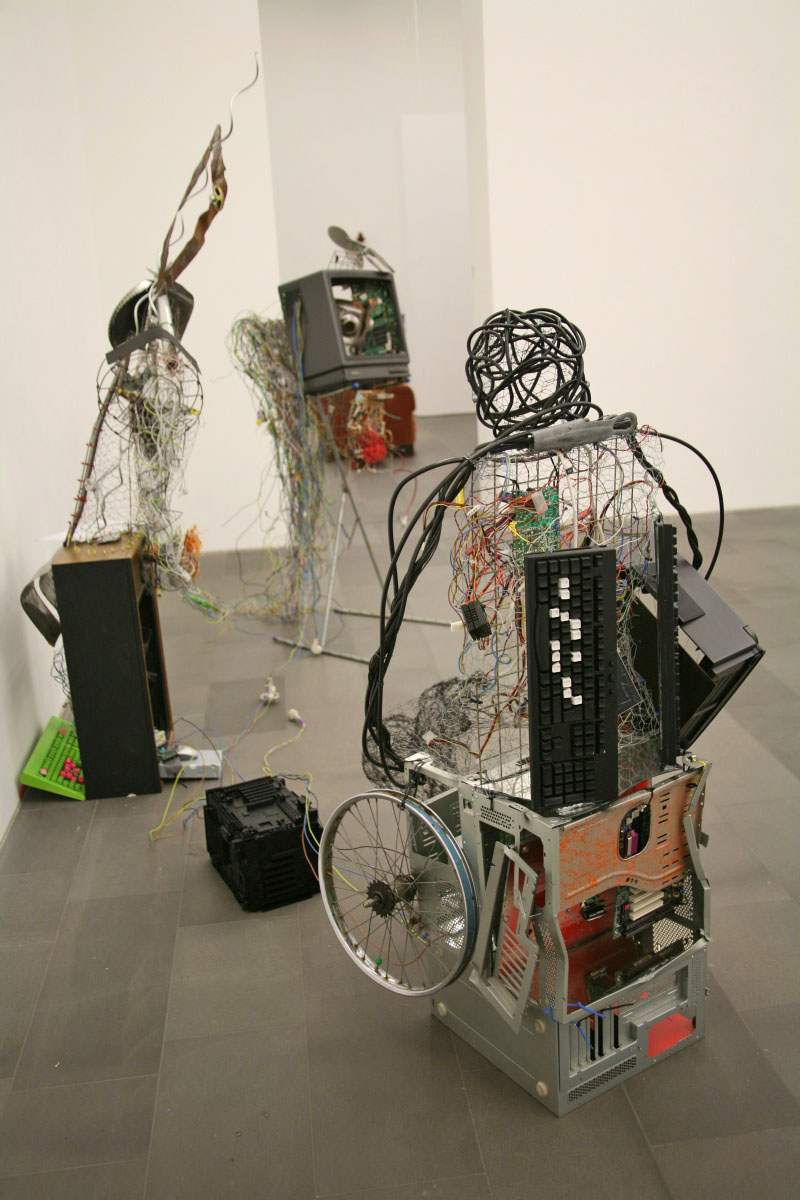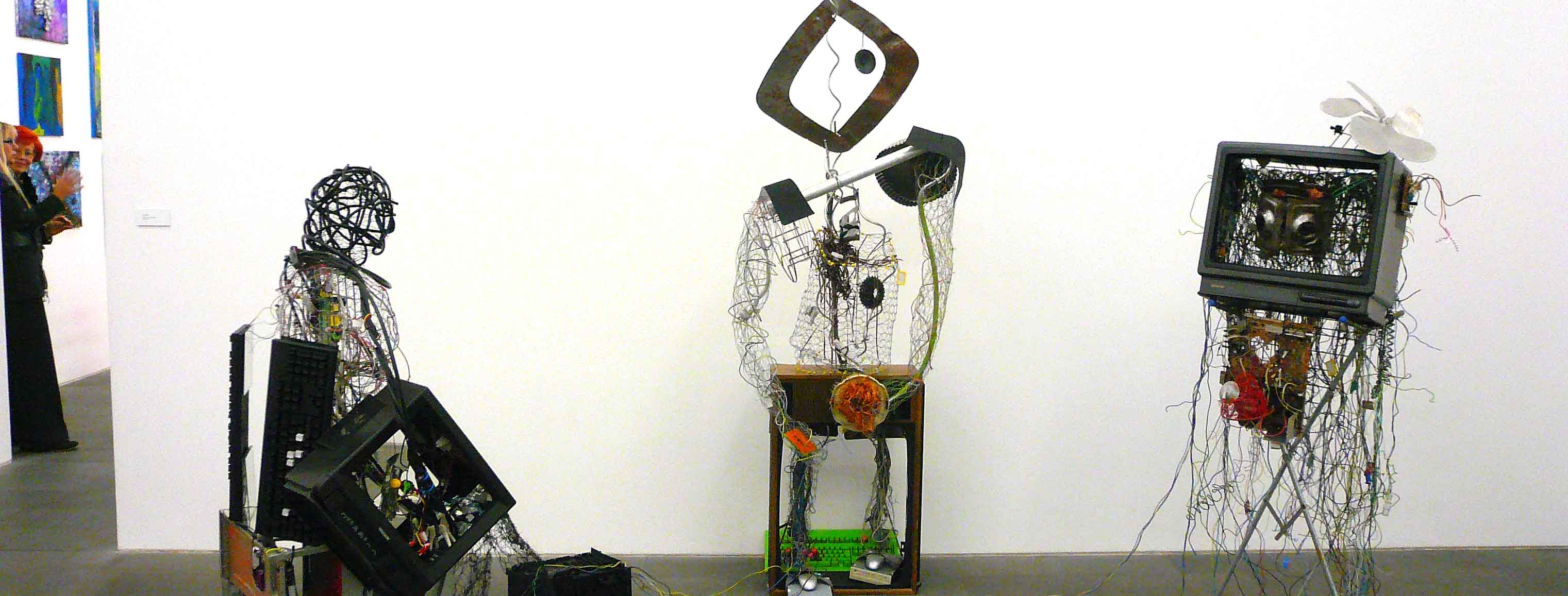 Projektbeitrag Plastik aus 3 Figuren „Herzstück“, Montage aus verschiedenen Materialien, Metall, Computerelementen, Gegenstände, Farbe (2011/12)