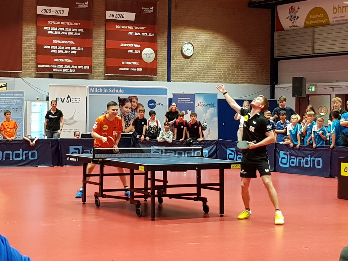 Gegen Ende der Veranstaltung erfolgte noch ein spektakulärer Schaukampf zwischen dem frisch gekürten Deutschen Meister bei den Finals in Erfurt Kay Stumper und dem aktuellen norvegischen Meister Borgar Haug – zwei tolle junge TT-Profis. Der Trainer von Borussia Düsseldorf Danny Heister übernahm die Rolle des Schiedsrichters (oder auch Komikers).