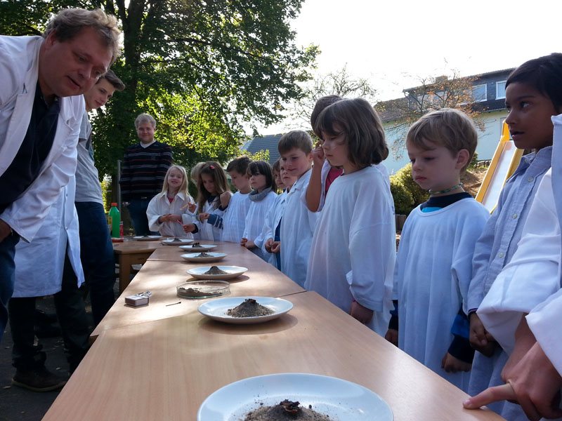Unter der Betreuung von Robin Henrich, Marco Kirchhoff, Wesley Klingauf und Alexander Schmitt führten die Kinder im zweiten Teil des Vormittags eigene Experimente an mehreren Stationen durch. Hierbei trieb beispielsweise die „Schlange des Pharaos“ ihr Unwesen und zahlreiche Backpulverraketen schossen in den Himmel.