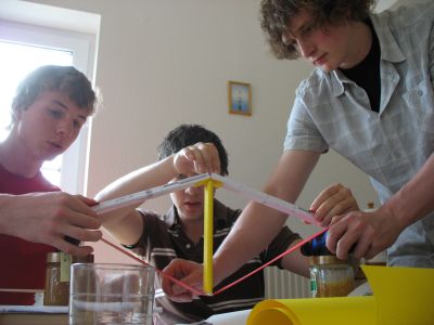 Bei der diesjährigen Endausscheidung ist unser Gymnasium mit einem dreiköpfigen Team angetreten. Die Oberstufenschüler Bastian Kurth, Sven Vitt und Michael Zeitler haben eine trapezförmige Brücke konstruiert und gebaut. Der obere Brückenaufbau besteht aus zwei aneinanderstoßenden Fahrbahnteilen, die in der Mitte von unten durch einen Pylon gestützt werden. Die vom Pylon aufgenommenen Vertikalkräfte werden ihrerseits von einem Unterzug aus Papierband abgefangen. Mit ihrer Brücke konnten die Schüler sich gegen die ca. 20 Teilnehmergruppen deutlich durchsetzen. Die 230 g schwere Papierbrücke hielt einer Last von über 112 kg stand, d. h. sie konnte das fast 500fache ihres Eigengewichtes tragen: der absolute Spitzenwert dieses Wettbewerbs.