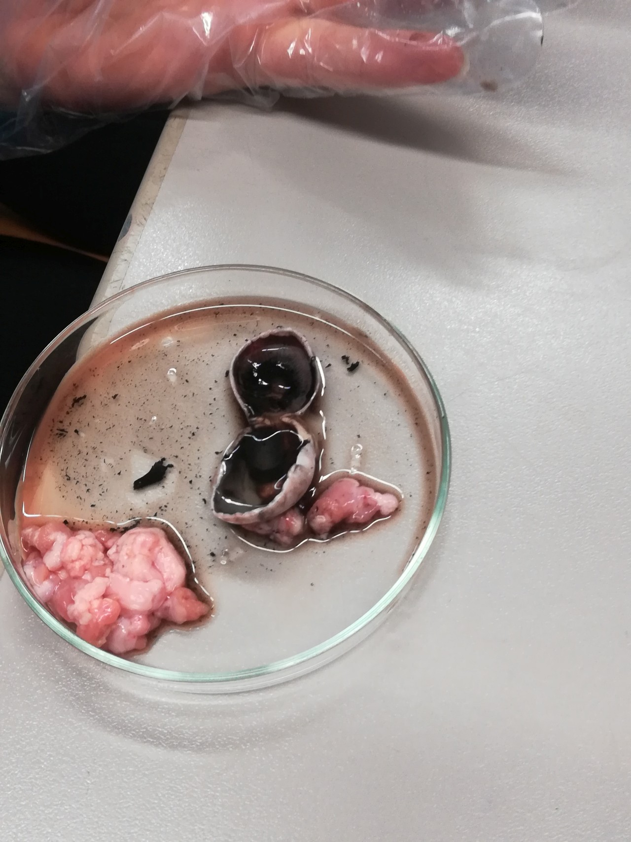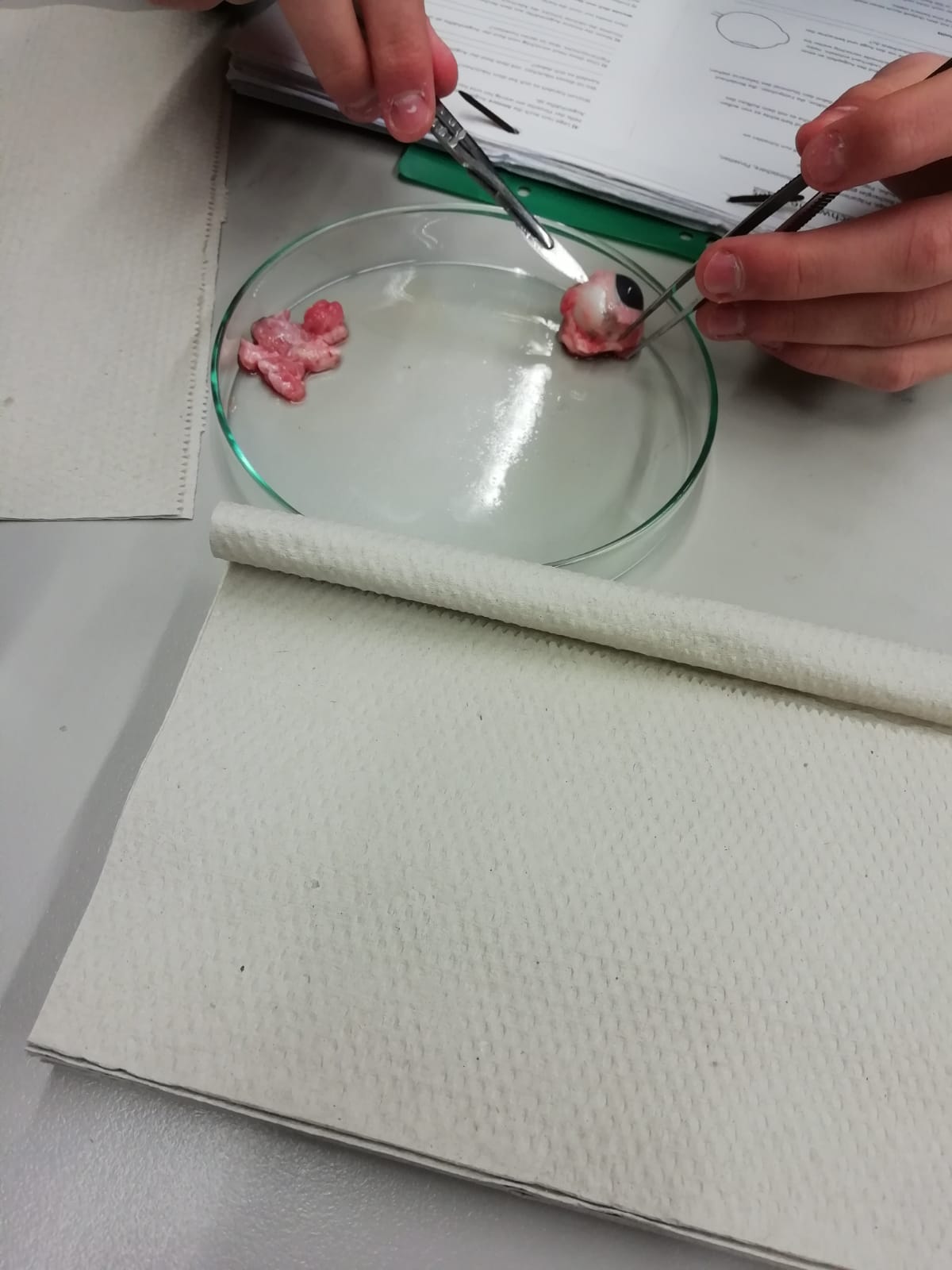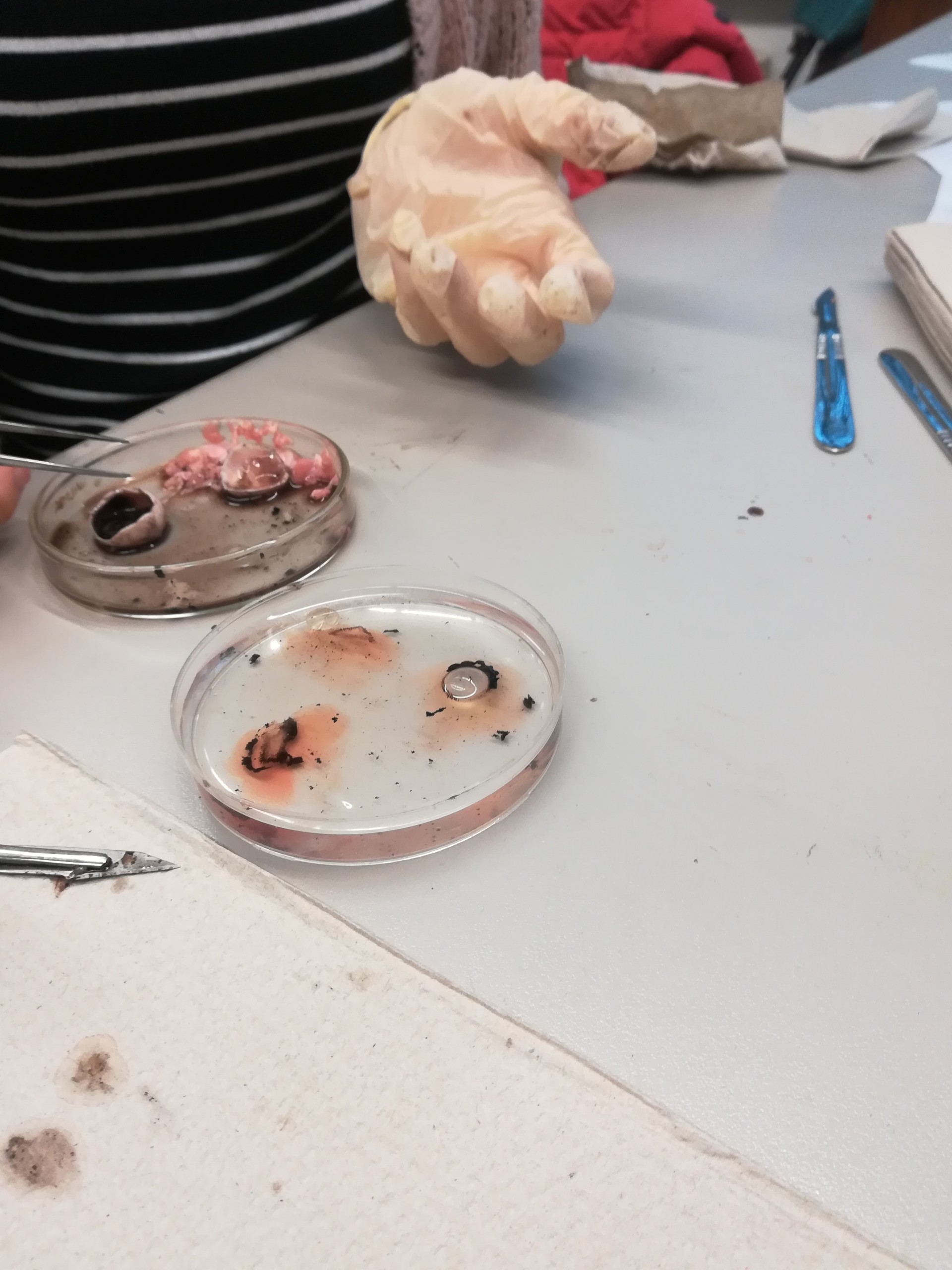 Danach galt es, das Auge in eine vordere und eine hintere Hälfte zu zerteilen mit dem Ziel, den Glaskörper zu untersuchen. Dabei wurde die Linse aus diesem entfernt und ihre Vergrößerungskraft gesondert untersucht, indem wir einen gedruckten Text durch die Linse betrachteten.