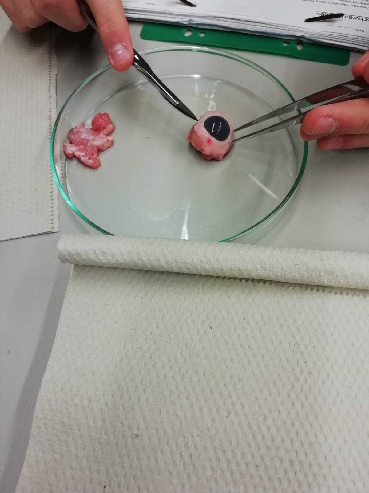 In dem Biologie-LK des Abiturjahrgangs 2020 soll ein Teil des Unterrichtsinhalts den Schülern durch selbstständiges Vermitteln an ihre Mitschüler beigebracht werden (Methode „Lernen durch Lehren“). So präparierten und untersuchten wir unter Anleitung von Kursteilnehmern Schweineaugen im Rahmen der Unterrichtseinheit „Neurobiologie im Auge“. Schweineaugen eignen sich dazu besonders gut, weil ihr Aufbau dem Auge des Menschen sehr ähnelt.