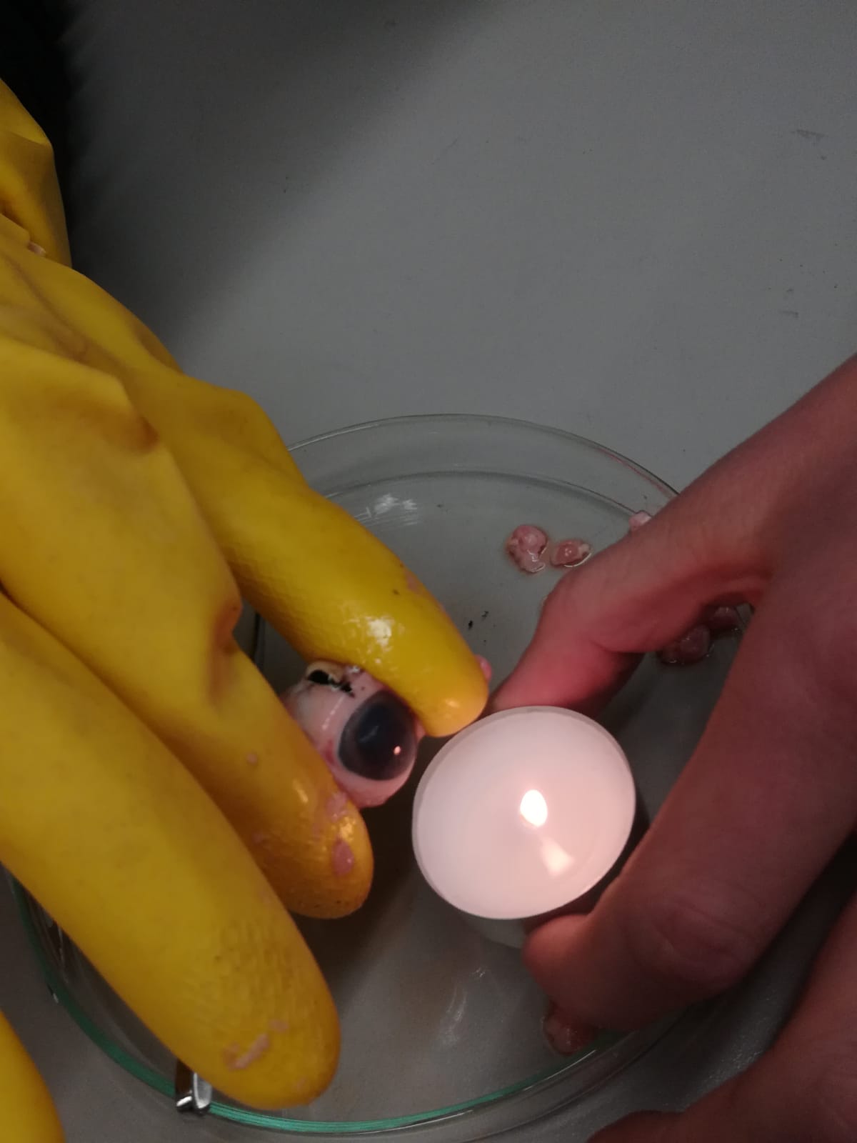 Zunächst sollte ein kleines Loch in die Oberseite des Auges geschnitten werden, um die Funktion der Netzhaut zu untersuchen. Dies geschah durch den Versuch, ein Teelicht vor das Auge zu halten und die Abbildung zu beobachten, die sich auf der Netzhaut zeigte.