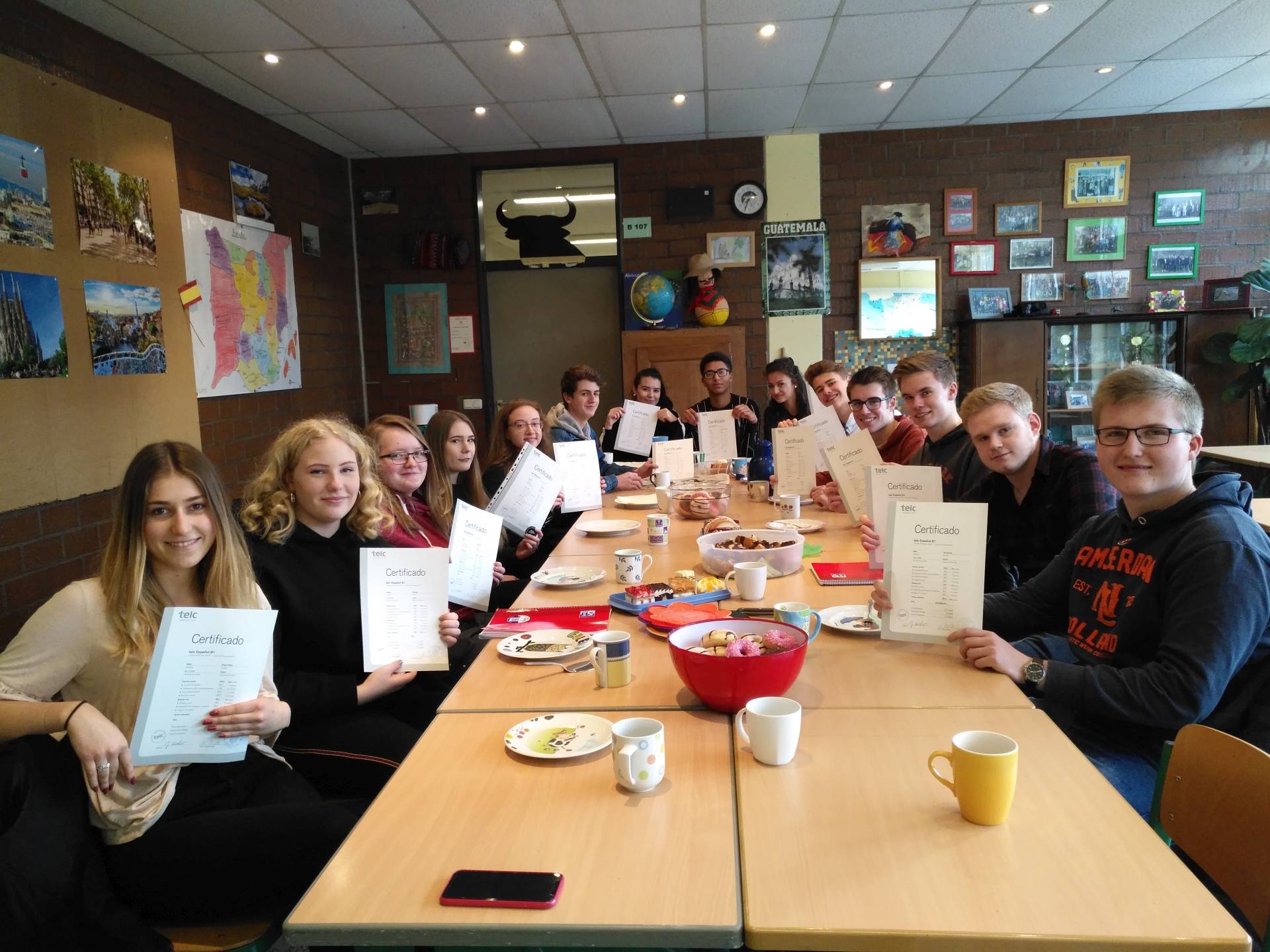 Nach einer Vorbereitung von einem Jahr stellten sich die Mitglieder des Projektkurses Spanisch kürzlich einer externen Prüfung, die ihnen Sprachkenntnisse auf dem Niveau B 1 bescheinigt. Da die Ergebnisse nun vorliegen, durfte Herr Wirtz den stolzen Schülerinnen und Schülern der Jahrgangsstufe 12 ihre Zertifikate überreichen. Anschließend wurde der Erfolg mit Kaffee und Kuchen gefeiert.