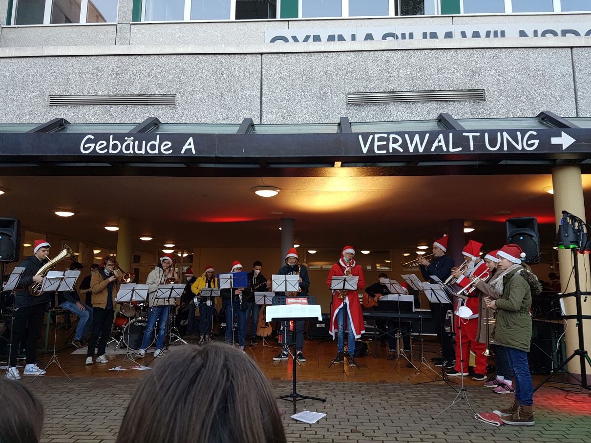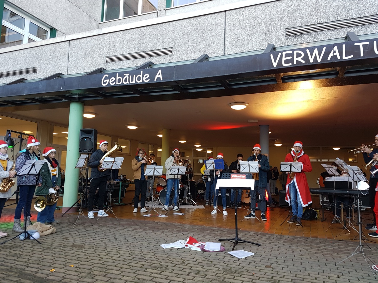 Die Big Band steuerte zudem weihnachtlich, swingende Stücke bei und sorgte an einem wunderschönen, sonnigen Wintermorgen auf dem Pausenhof für fröhliche Weihnachtsmarkt-Stimmung.