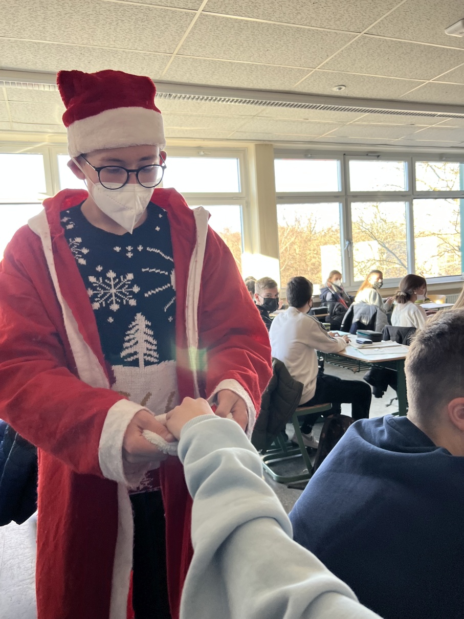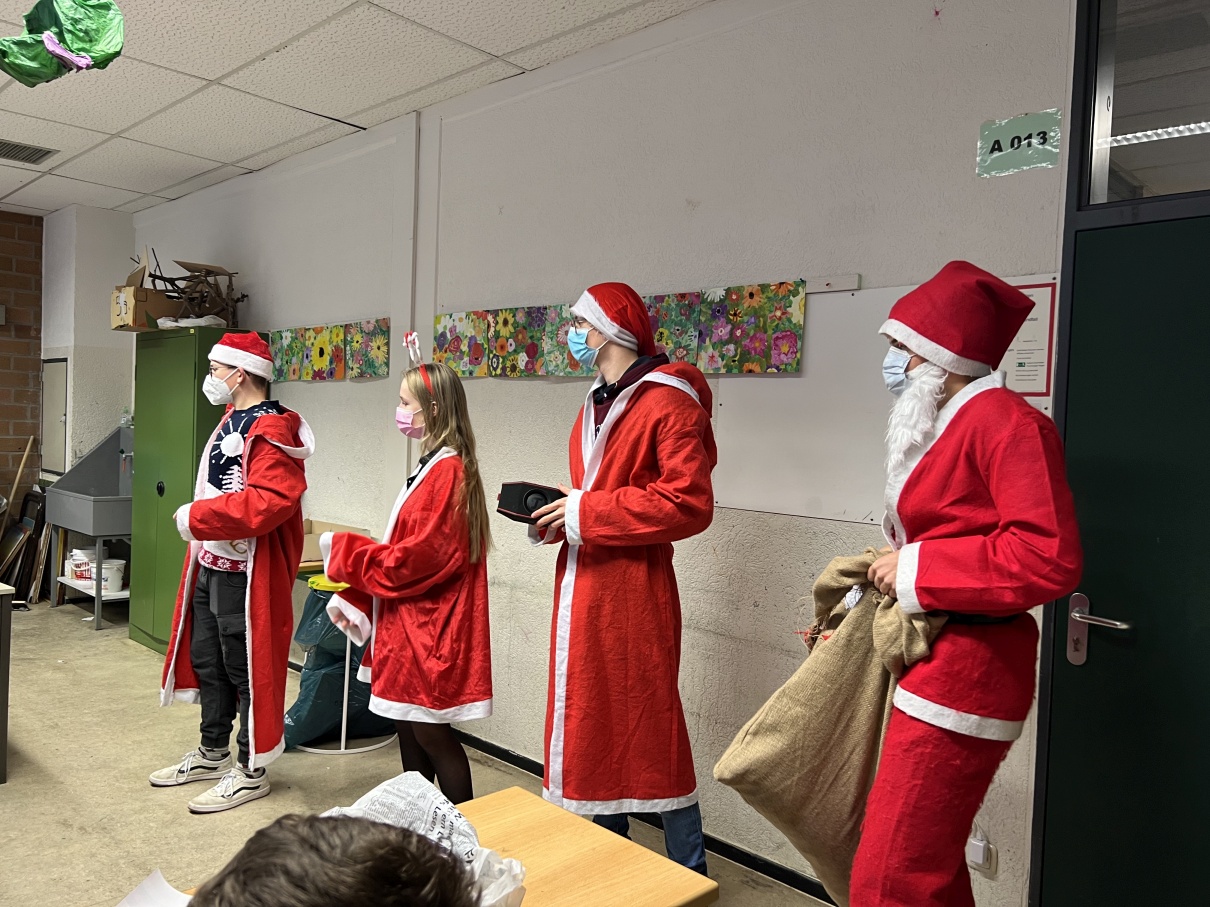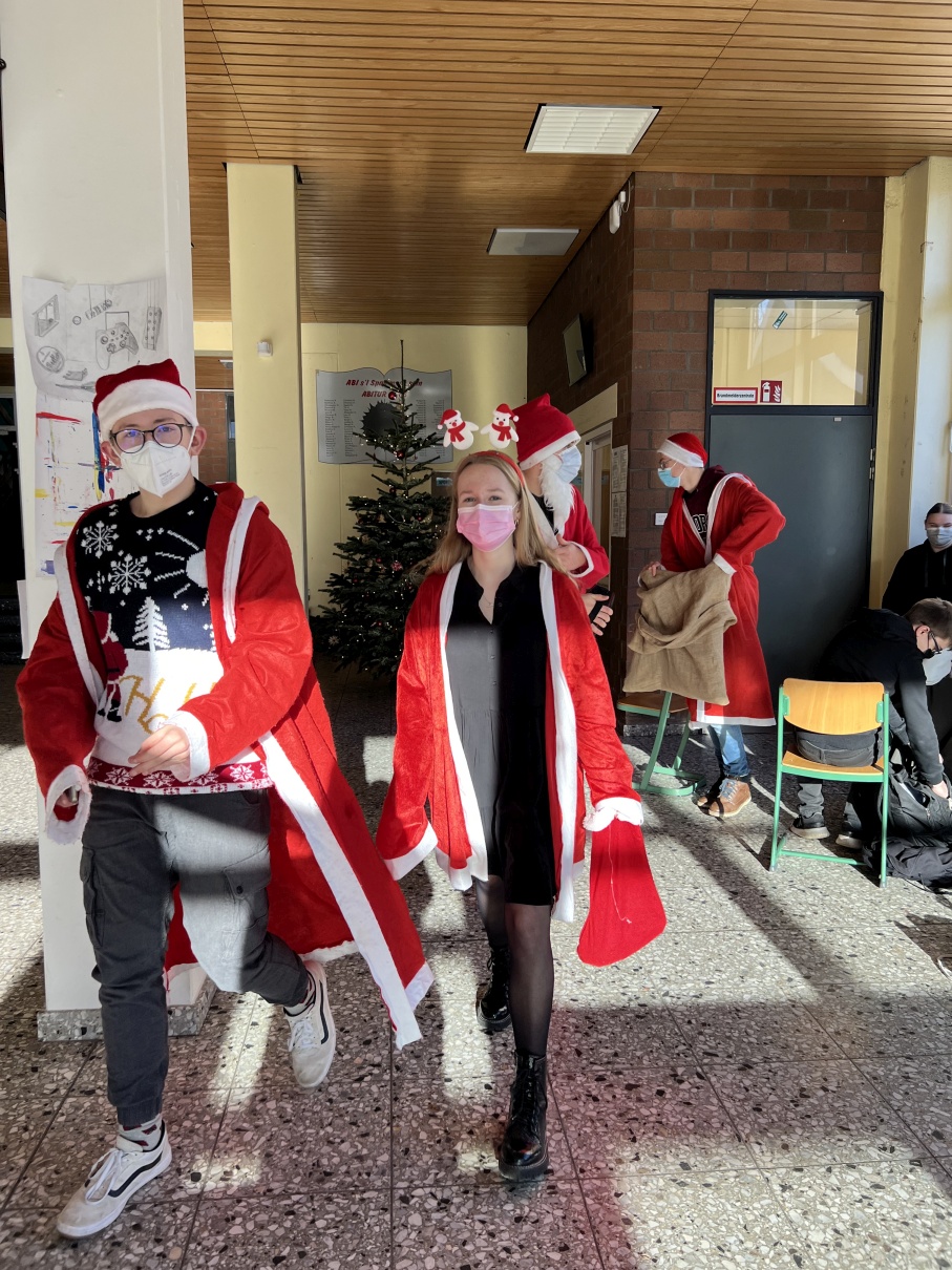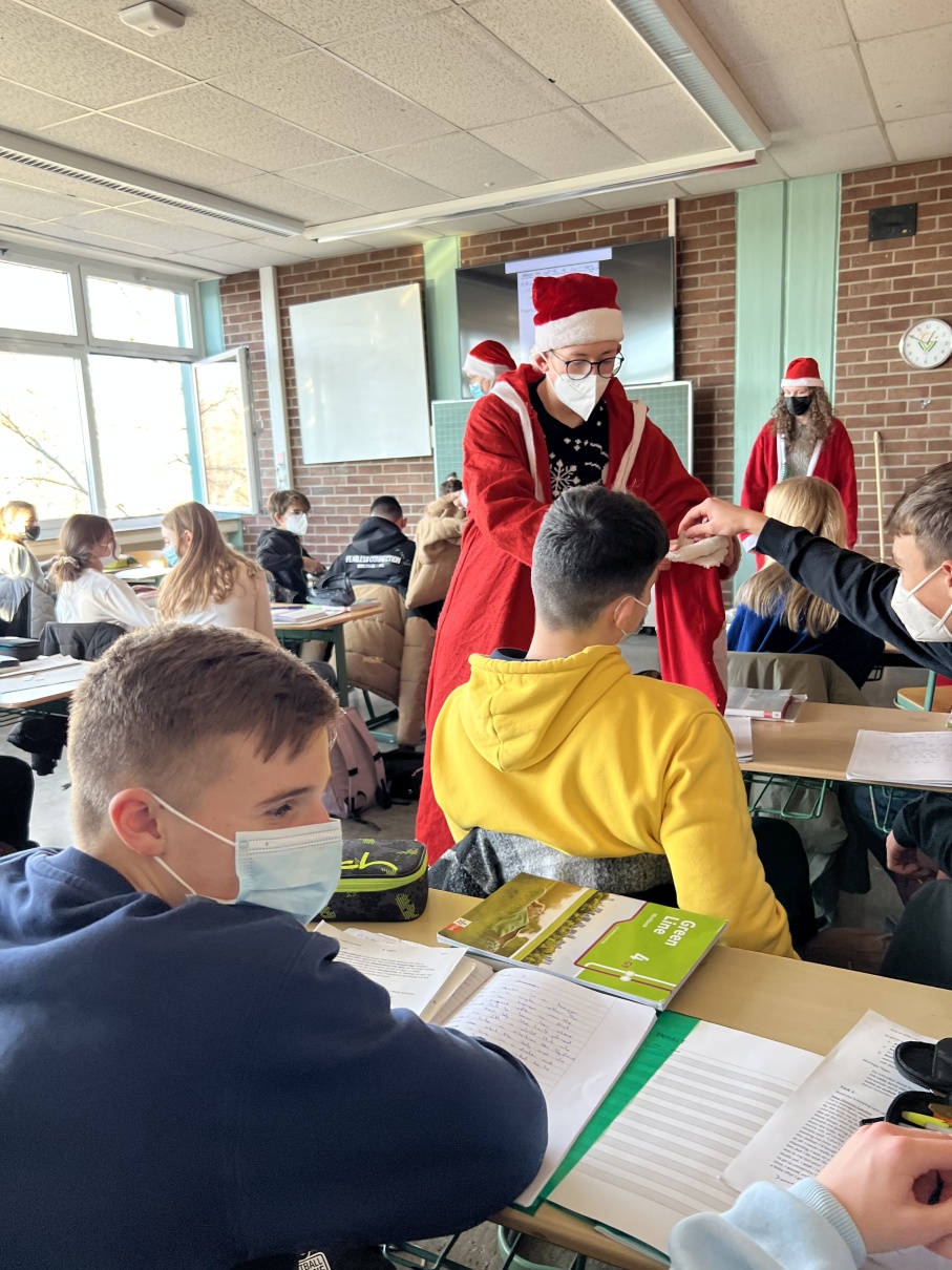 Bei der traditionellen Nikolaus-Aktion am 6. Dezember 2021 hatte das SV-Team (Ben, Emelie, Finn, Laurenz, Sophie) als Nikoläuse verkleidet alle Klassen und Kurse der Schule besucht und gegen eine kleine Spende erfolgreich Hunderte von Schoko-Nikoläusen verteilt. Ergänzt wurde der SV-Aktionstag in den Pausen durch einen Kuchen- und Waffelverkauf unter Federführung von Nikolas Wolff, die von der Schülervertretung, also allen Klassen- und Jahrgangsstufensprecher*innen (bzw. ihren Eltern ;-), im Vorfeld fleißig gebacken worden waren.