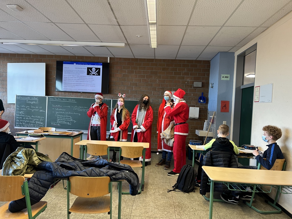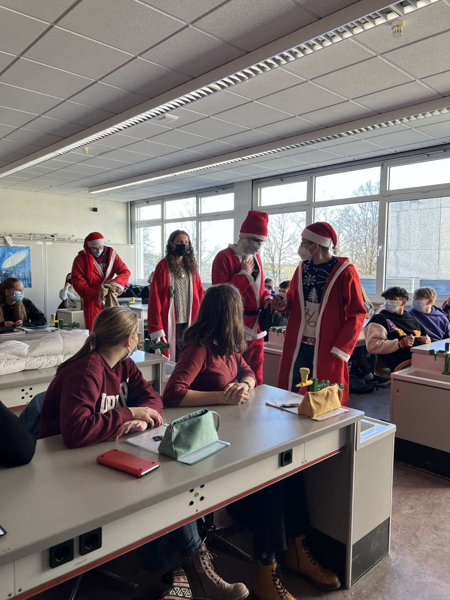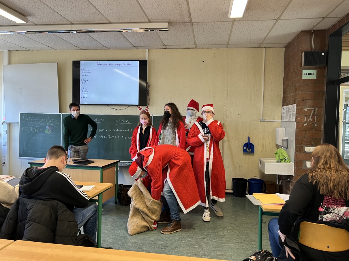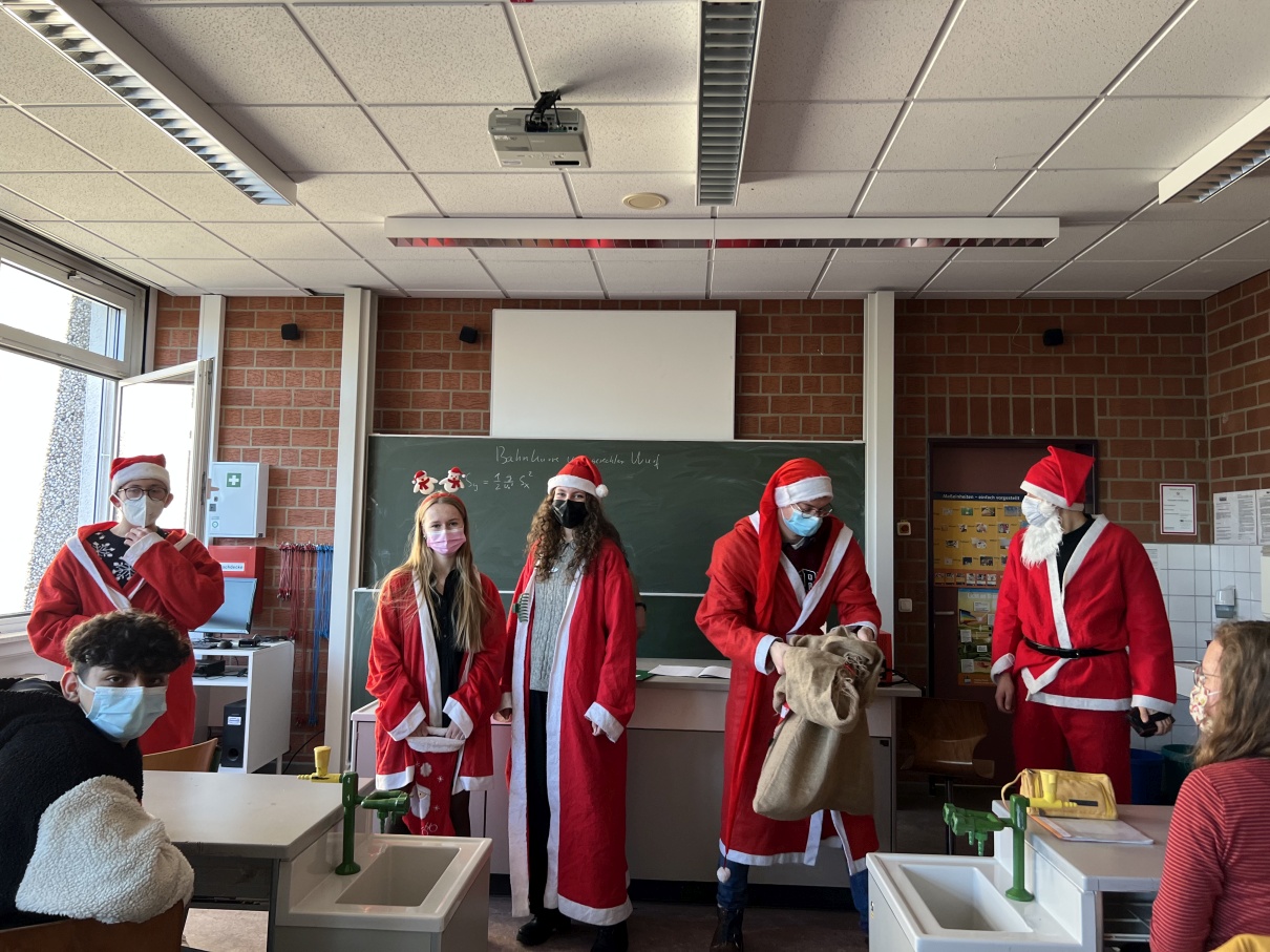 Bei der traditionellen Nikolaus-Aktion am 6. Dezember 2021 hatte das SV-Team (Ben, Emelie, Finn, Laurenz, Sophie) als Nikoläuse verkleidet alle Klassen und Kurse der Schule besucht und gegen eine kleine Spende erfolgreich Hunderte von Schoko-Nikoläusen verteilt. Ergänzt wurde der SV-Aktionstag in den Pausen durch einen Kuchen- und Waffelverkauf unter Federführung von Nikolas Wolff, die von der Schülervertretung, also allen Klassen- und Jahrgangsstufensprecher*innen (bzw. ihren Eltern ;-), im Vorfeld fleißig gebacken worden waren.
