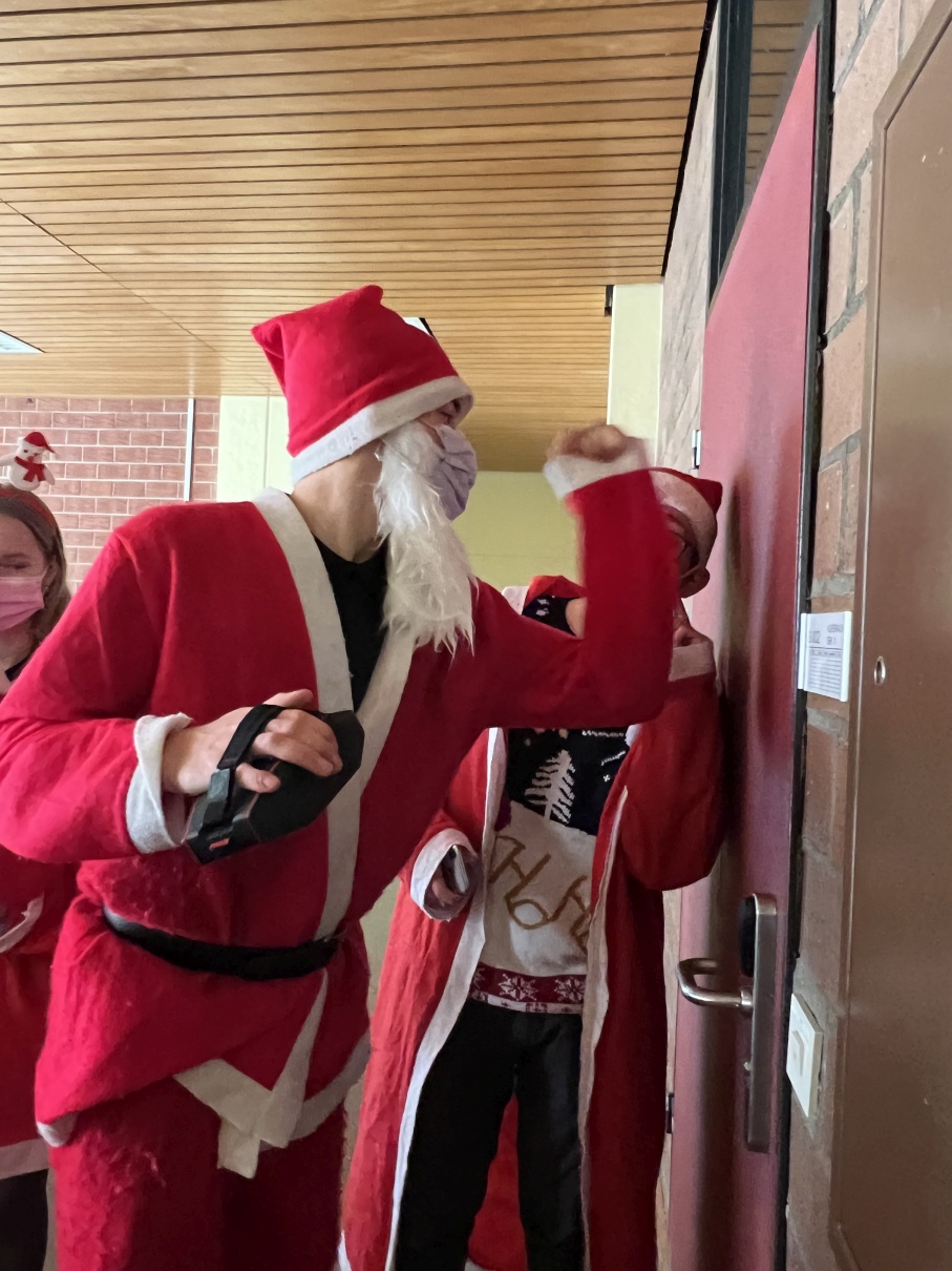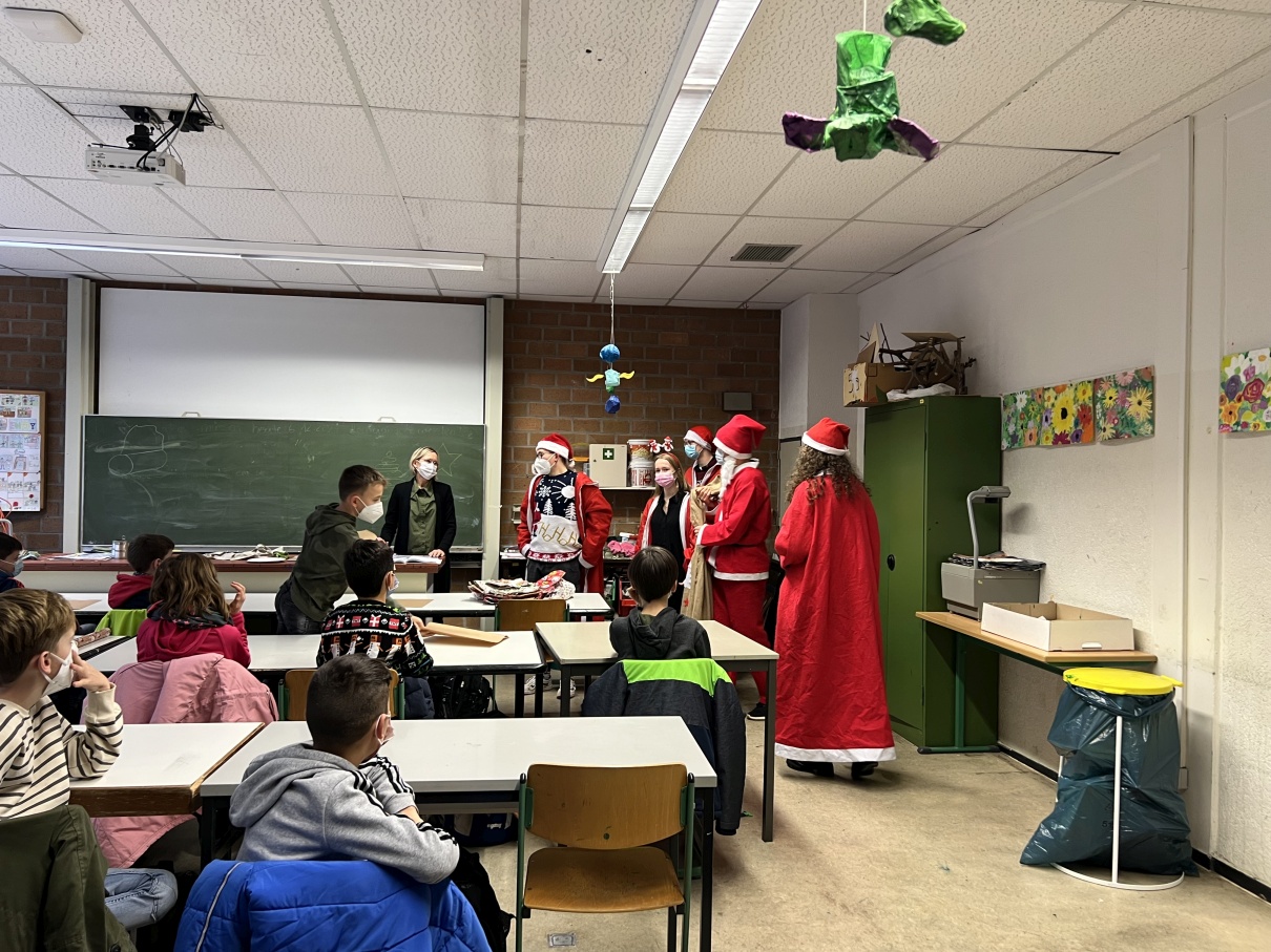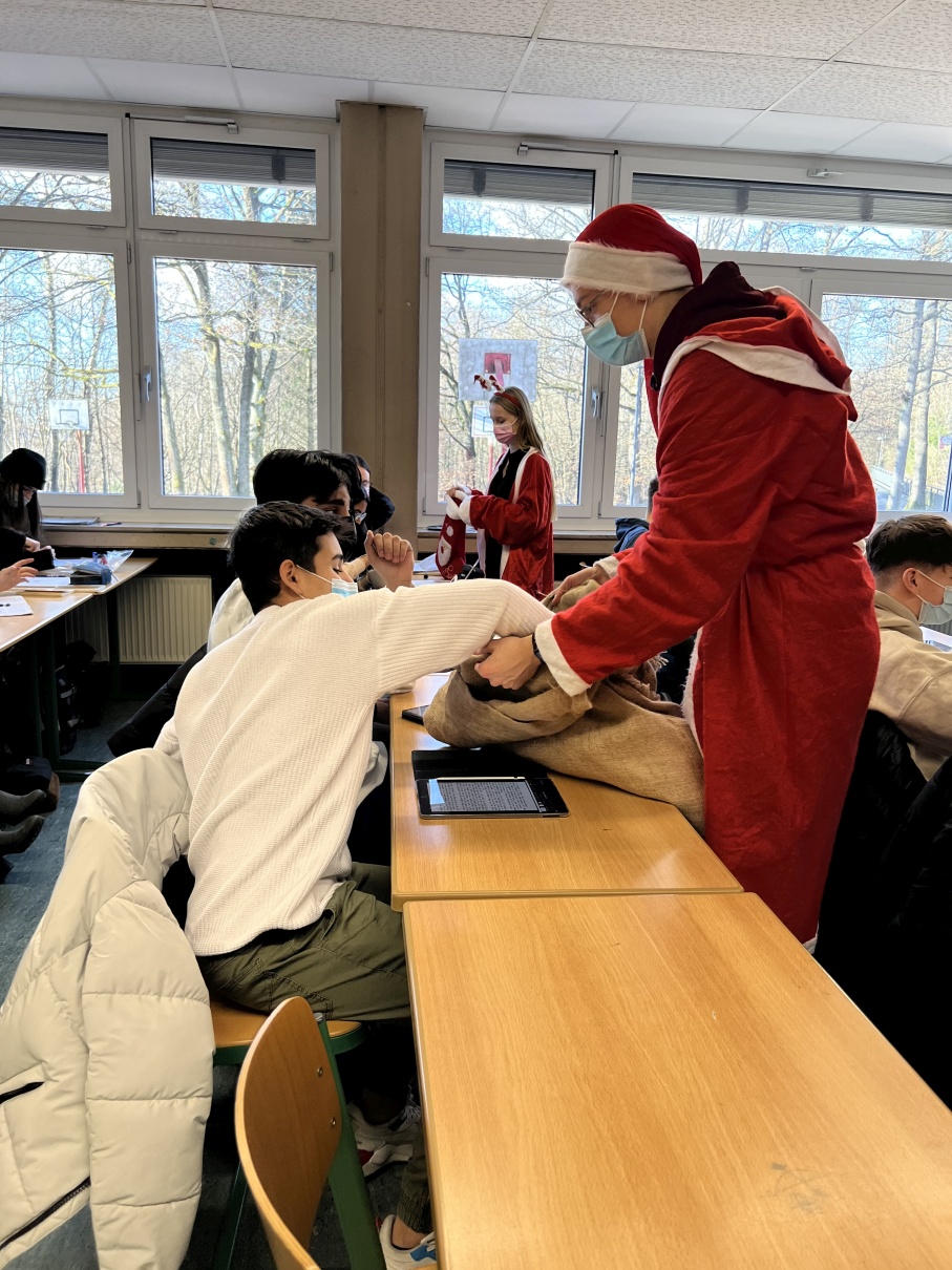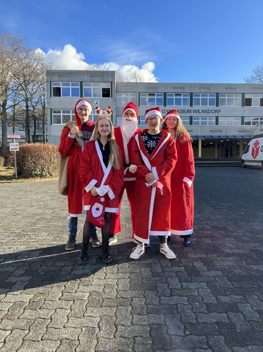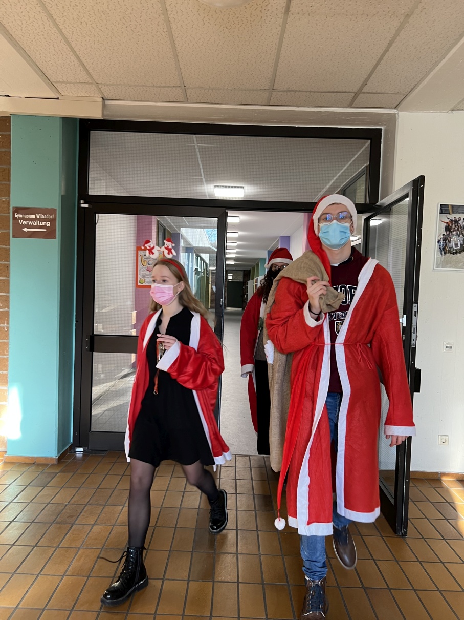 Bei der traditionellen Nikolaus-Aktion am 6. Dezember 2021 hatte das SV-Team (Ben, Emelie, Finn, Laurenz, Sophie) als Nikoläuse verkleidet alle Klassen und Kurse der Schule besucht und gegen eine kleine Spende erfolgreich Hunderte von Schoko-Nikoläusen verteilt. Ergänzt wurde der SV-Aktionstag in den Pausen durch einen Kuchen- und Waffelverkauf unter Federführung von Nikolas Wolff, die von der Schülervertretung, also allen Klassen- und Jahrgangsstufensprecher*innen (bzw. ihren Eltern ;-), im Vorfeld fleißig gebacken worden waren.