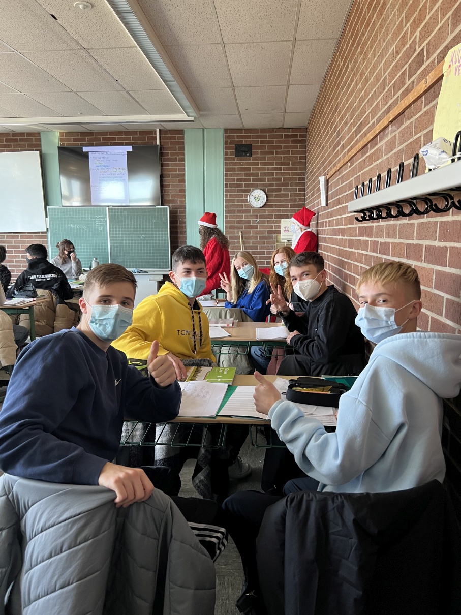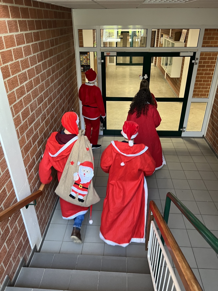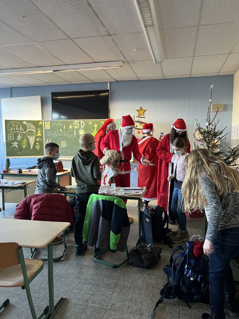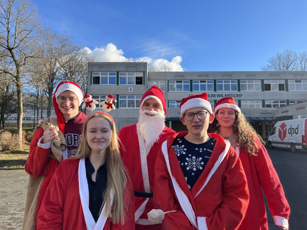Bei der traditionellen Nikolaus-Aktion am 6. Dezember 2021 hatte das SV-Team (Ben, Emelie, Finn, Laurenz, Sophie) als Nikoläuse verkleidet alle Klassen und Kurse der Schule besucht und gegen eine kleine Spende erfolgreich Hunderte von Schoko-Nikoläusen verteilt. Ergänzt wurde der SV-Aktionstag in den Pausen durch einen Kuchen- und Waffelverkauf unter Federführung von Nikolas Wolff, die von der Schülervertretung, also allen Klassen- und Jahrgangsstufensprecher*innen (bzw. ihren Eltern ;-), im Vorfeld fleißig gebacken worden waren.