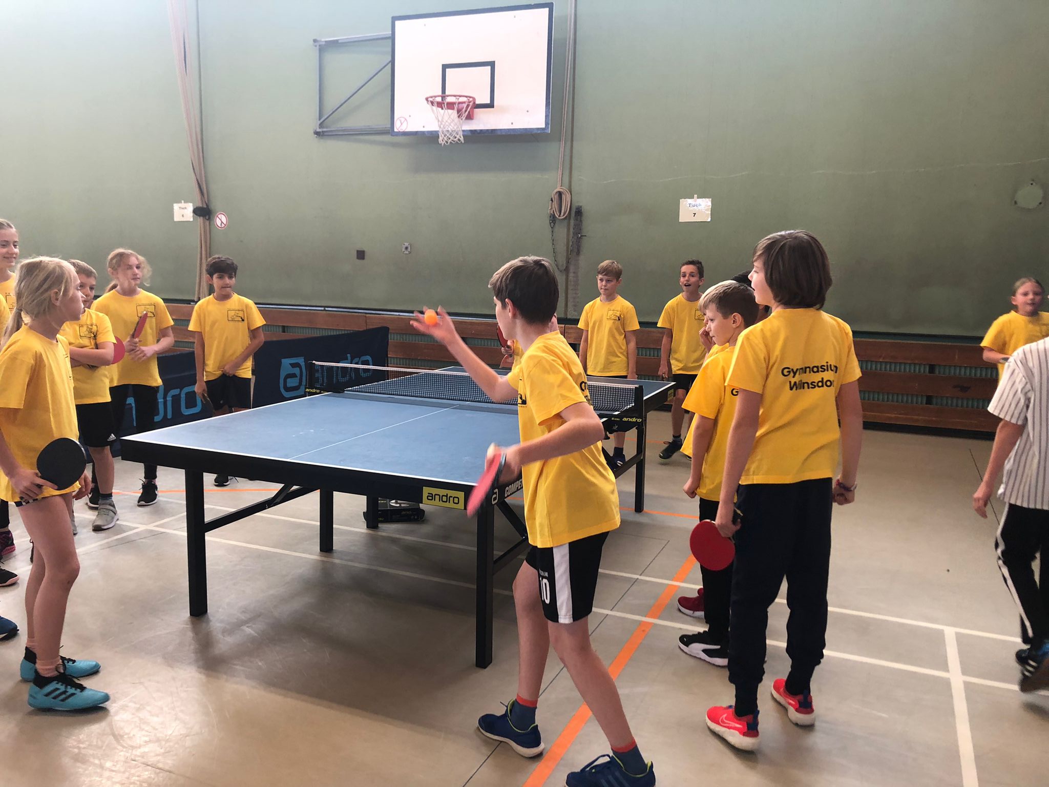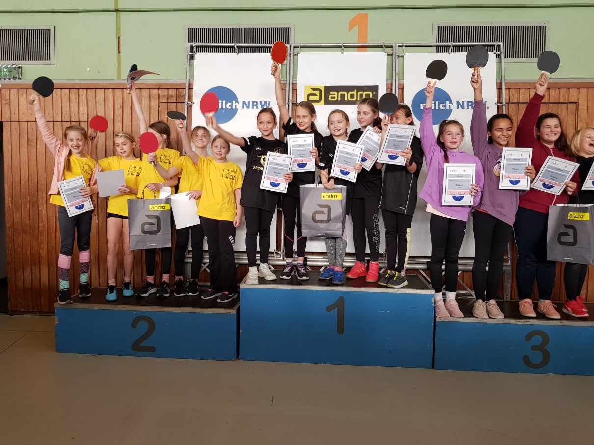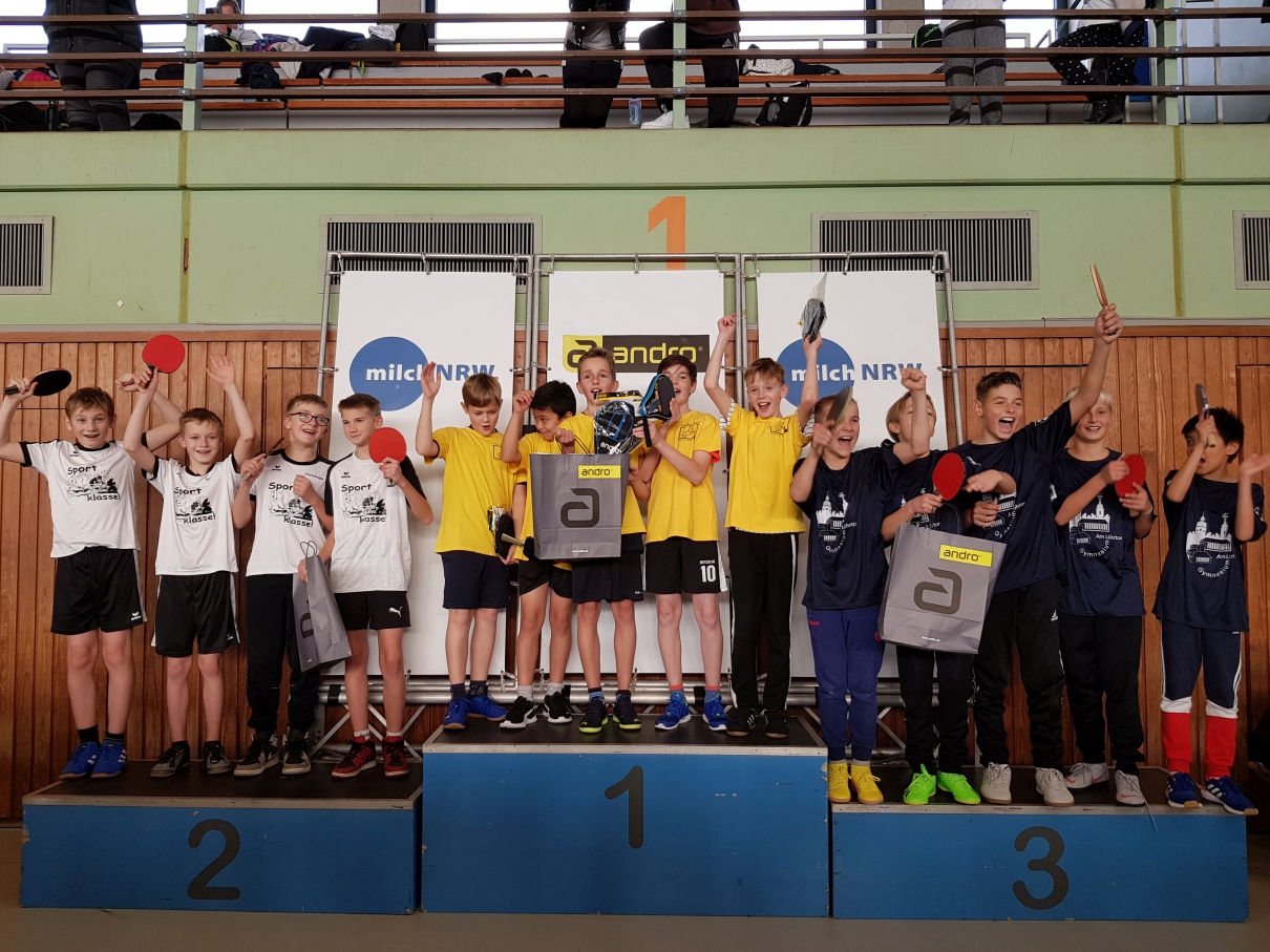 Ganz anders hingegen die Jungen der 6b: sie waren hochmotiviert und konzentriert. Mit dieser Einstellung schafften sie es bis ins Endspiel und konnten hier den entscheidenden Punkt erzielen und als Sieger den Tische verlassen. Damit haben sie sich für das Landesfinale am 15. Dezember in Düsseldorf (im Zentrum des DTTB, auch der Spielort von Borussia Düsseldorf) qualifiziert.
