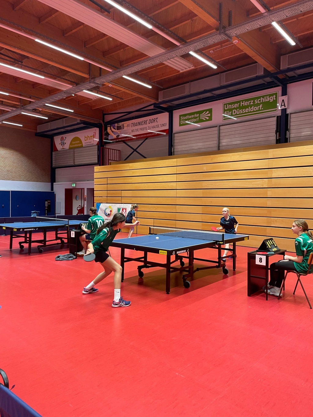 Die Mädchen der Wettkampfklasse III (Frida Schellenberg 7d, Lilli Schlickau 6e, Paula Irle 7d, Lola Dax 7c, Klara Streit 7d, Linda Schöler 7d, Marta Goslawski 6b) hatten sich durch einen klaren Sieg bei den Regierungsbezirksmeisterschaften im Dezember für das Landesfinale im TT-Zentrum in Düsseldorf qualifiziert.