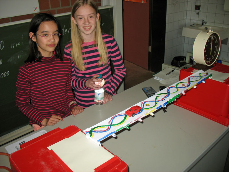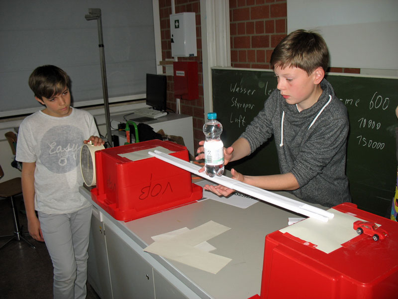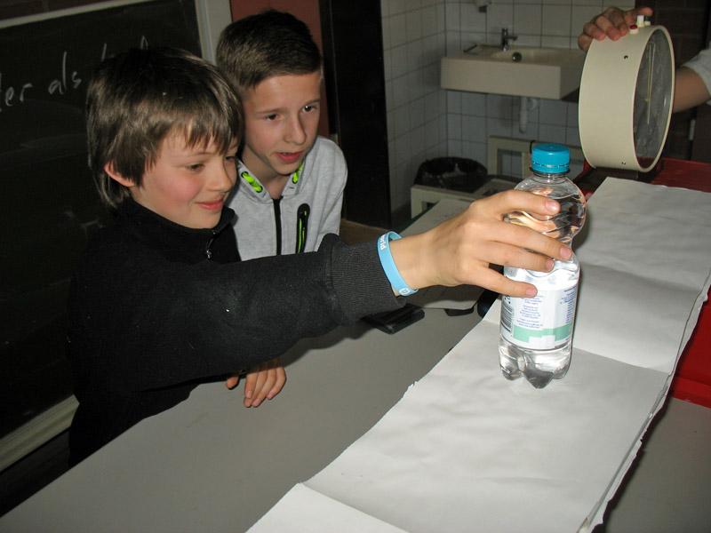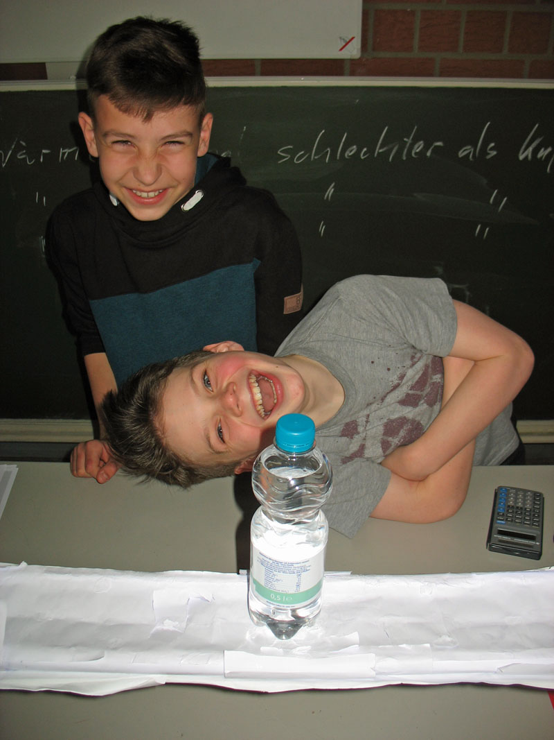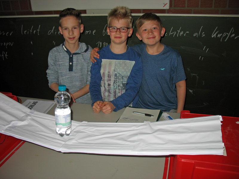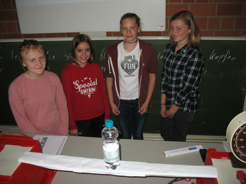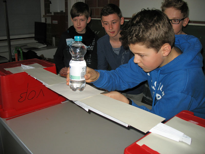 Beim diesjährigen Wettbewerb „Physik aktiv“ der Bezirksregierung Arnsberg waren alle 6-Klässler aufgerufen, unter dem Motto „Brückenschlag“ eine Papierbrücke zu konstruieren, die eine Spannweite von 80 cm überspannt und eine aufrechtstehende 0,5-Liter-PET-Wasserflasche trägt.