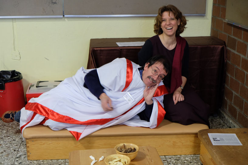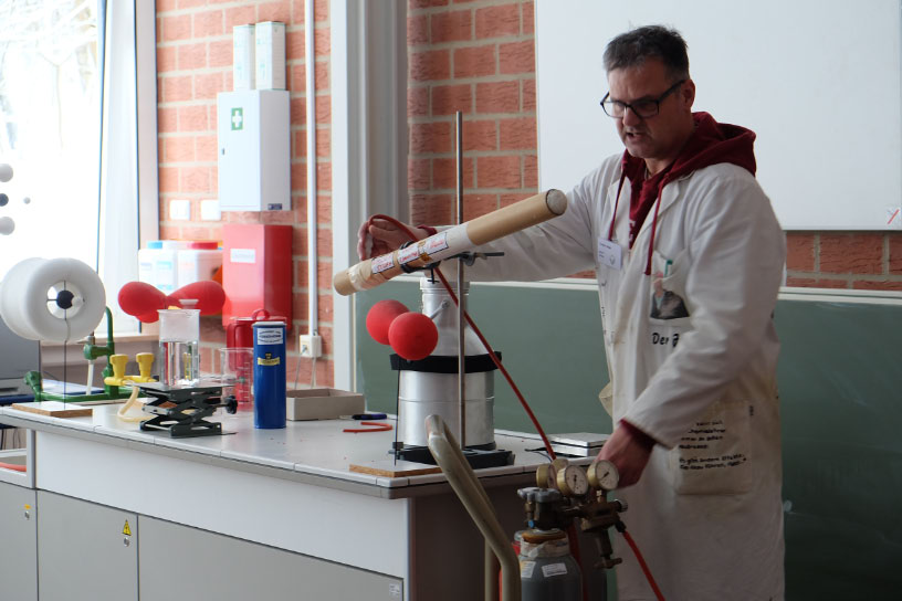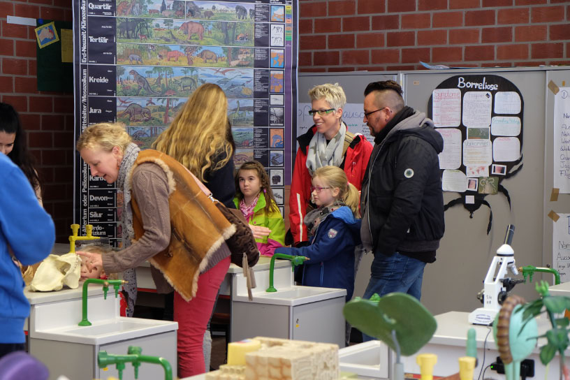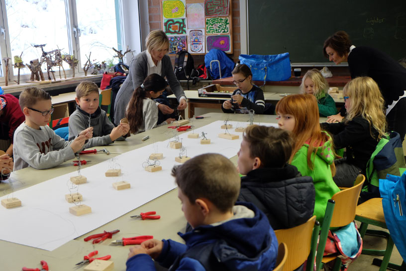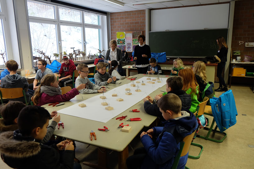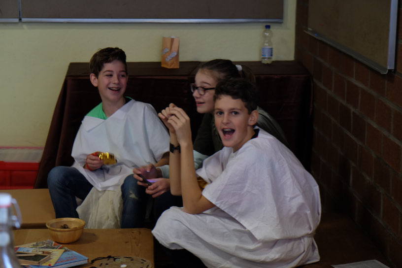 So sorgte in den Räumen der Chemiefachschaft eine ‚Gummibärchenfressmaschine‘ für Staunen, bei den Biologen konnten die Kinder als Jungforscher Mikrowelten entdecken und mussten sich bei den Physikern vor Hochspannungsblitzen in Sicherheit bringen. Für die Fortsetzung der Tour war es interessant, wie man sich auf Englisch, Französisch und Spanisch verständigt. Anschließend konnte wie bei den alten Römern ein Mahl auf einer Liege eingenommen werden. – Im anderen Gebäude konnten unsere Besucher in die Welt der schönen Künste eintauchen und selbst musizieren, Drahtskulpturen formen und im Theater in die Hexenküche von Goethes „Faust“ entführt werden. Einige mutige Kinder schlüpften dort auf der Bühne spontan in die Rolle von Katzen, um unsere großen Schauspieler zu unterstützen.