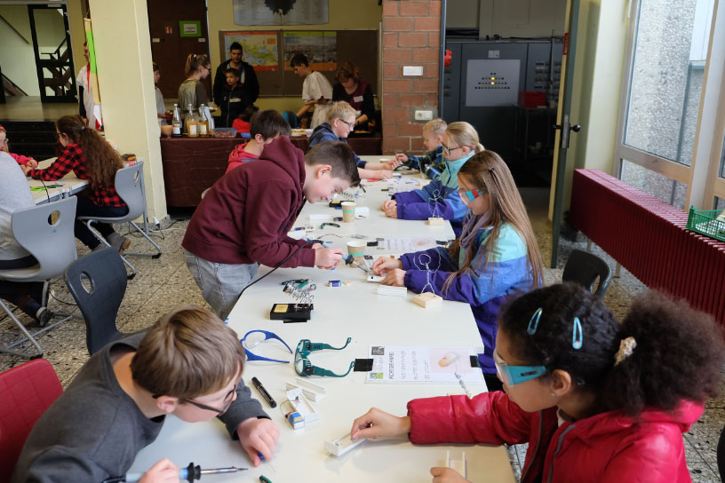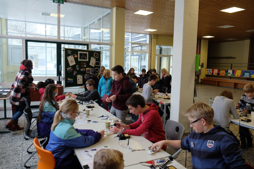 Eine wichtige Hilfe, um ihren Weg zu finden, konnten die Kinder mit der Unterstützung älterer Schüler sogar selbst zusammenbauen: eine kleine Taschenlampe, die anschließend mit nach Hause genommen werden durfte. Nach erfolgreicher Tour konnten sich unsere Abenteurer in der Cafeteria mit Waffeln und Popcorn stärken, wo traditionell der Förderverein zum geselligen Beisammensein einlud.