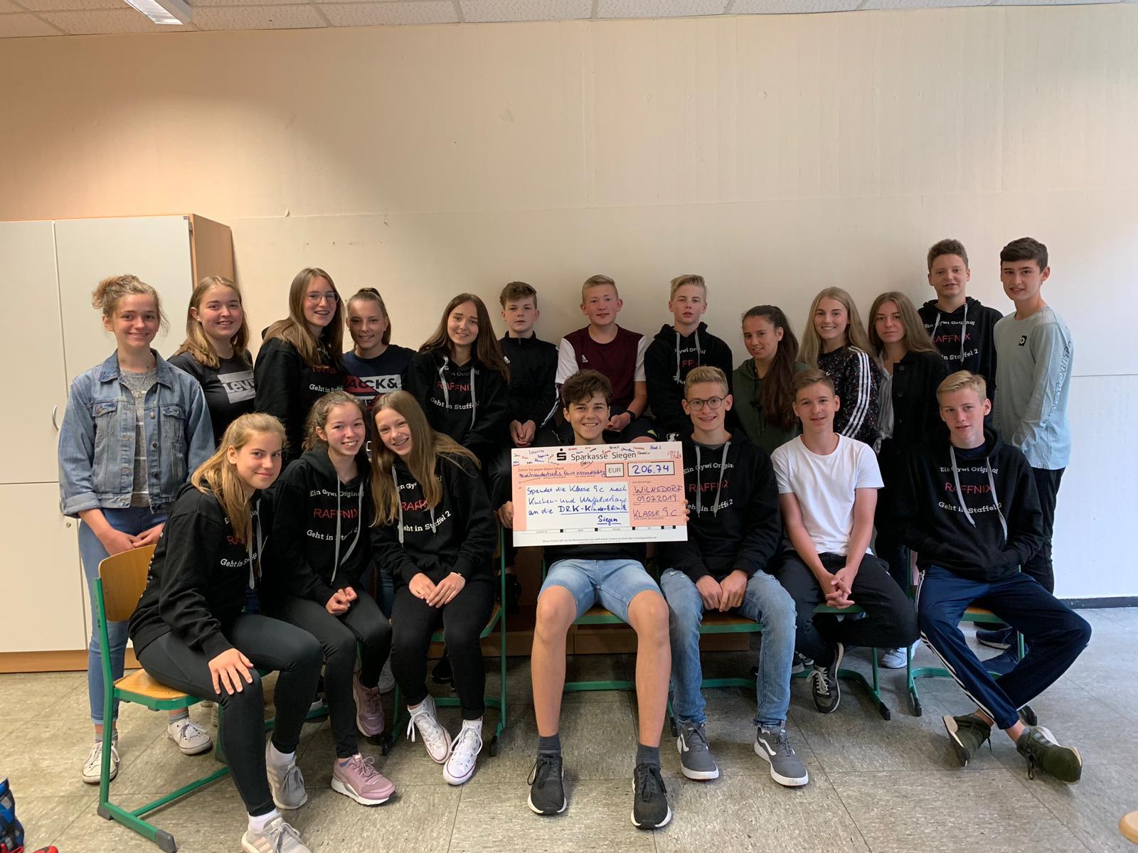 206,74 Euro beträgt die stolze Summe, welche die Klasse 9c im vergangenen Halbjahr bei einem selbst organisierten und durchgeführten Pausenverkauf von Kuchen, Muffins und Waffeln „erbackte“. Bereits im Vorfeld war gemeinsam mit den Klassenlehrern Herrn Schütz und Frau Behle überlegt worden, wer in den finanziellen Genuss des Gewinns kommen sollte. Die deutliche Mehrheit stimmte für die DRK-Kinderklinik in Siegen, welche sich nun über diese Spende freuen darf.